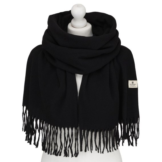 Stylowy szalik damski, dwustronny i w czarnym kolorze. Idealny na zimę, jesień i wiosenne chłody. Wykonany z wysokogatunkowego poliestru. Pasuje zarówno do eleganckiego płaszcza, jak i do casualowej kurtki. Szalik ze stylowymi frędzlami.