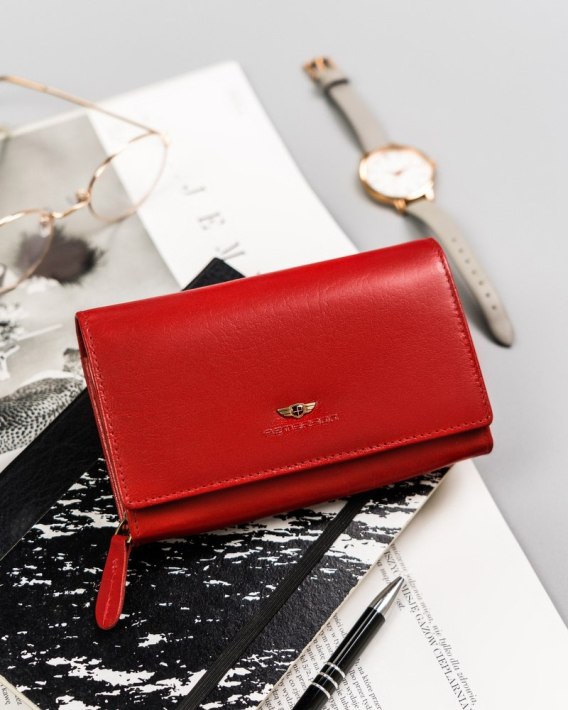 • Zawsze modny fason | Portfel o klasycznej stylistyce w klasycznym czerwonym kolorze. Model w orientacji poziomej, zapinany bezpiecznym i trwałym zatrzaskiem;