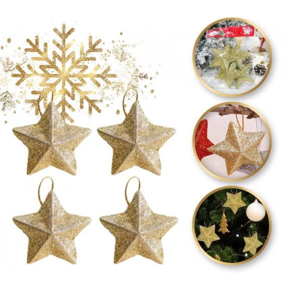 • Komplet zawieszek choinkowych, GWIAZDKI brokatowe 4 sztuki 7cm złote BSN54