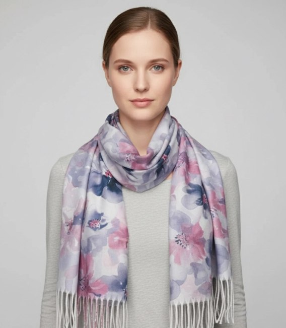 Kwiatowa kobieca chusta szal damski z frędzlami — połączeniem akwarelowego, kwiatowego wzoru i miękkiej tkaniny, które nadają lekkości i elegancji codziennym oraz bardziej wyjściowym zestawom. Doskonała na chłodniejsze dni, kiedy chcesz wyglądać modnie, nie rezygnując z wygody.