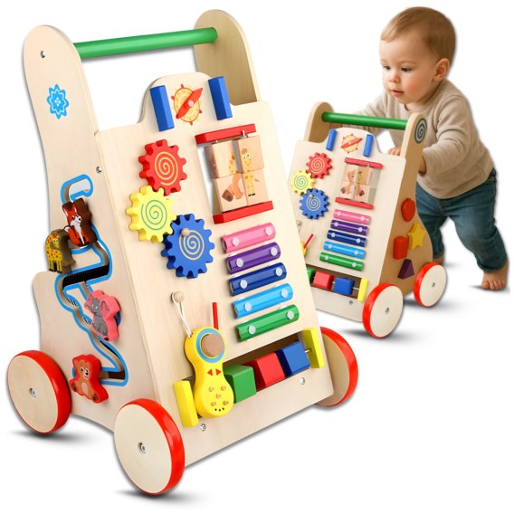 Ten kolorowy pchacz edukacyjny z drewna to idealna zabawka dla maluchów, które stawiają swoje pierwsze kroki. Solidna konstrukcja zapewnia bezpieczeństwo, a liczne funkcje edukacyjne rozwijają zdolności manualne, poznawcze i muzyczne dziecka.