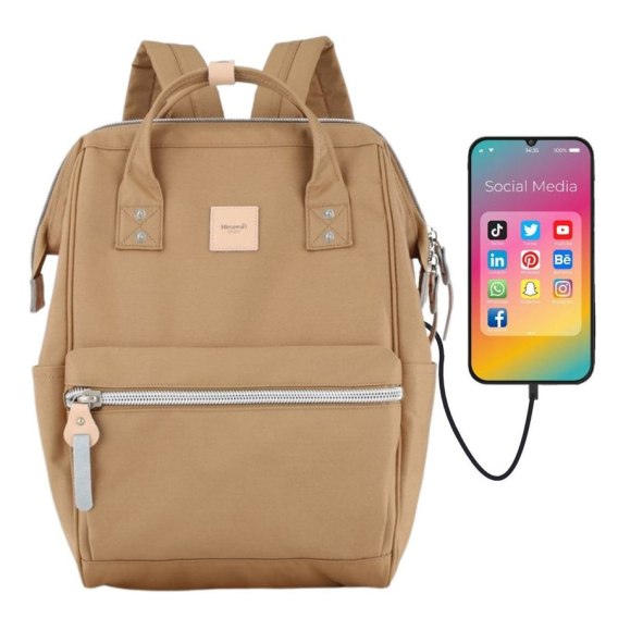 Stylowy plecak Himawari w brązowym kolorze. Nieprzemakalny, idealny do miasta i podróży. Pojemność na laptopa. Wyposażony w port USB, kieszeń główną zapinaną na zamek i boczne przegrody. Komfortowy i praktyczny.