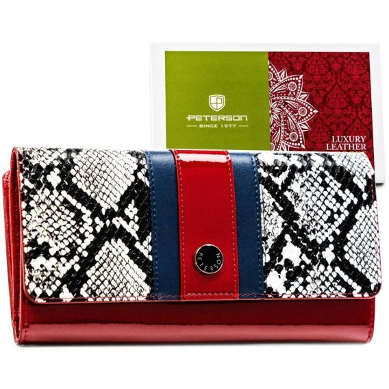 Portfel damski w kolorze czerwonym z wzorem na klapie imitującym skórę węża zamykany na zatrzask - Peterson