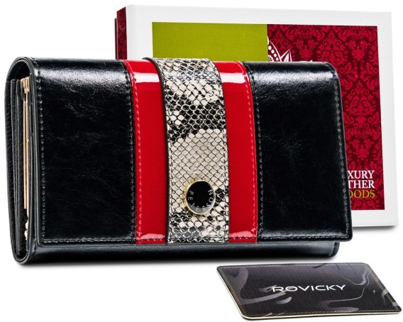 Elegancki portfel damski z klapą zdobioną wężowym wzorem. Wykonany z nabłyszczanej skóry naturalnej klasy premium. Akcesorium z zakładkami na karty, przegrodami na bilon i banknoty oraz kieszeniami na duże dokumenty.