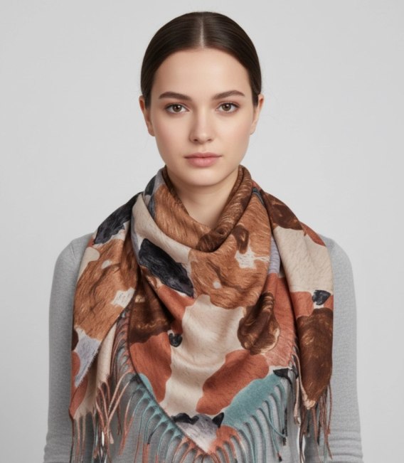 - Duży rozmiar — daje wiele sposobów noszenia: szal, komin lub narzutka