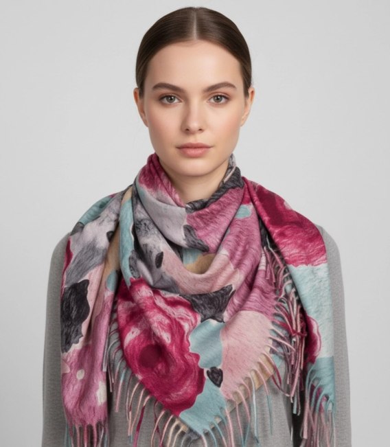 Wielobarwna elegancka chusta damski szal w kwiaty z frędzlami — uniwersalny i stylowy dodatek na jesień i zimę. Jej miękka tkanina i dekoracyjne frędzle łączą praktyczność z modnym akcentem, dzięki czemu sprawdzi się zarówno w codziennych, jak i bardziej eleganckich zestawieniach.