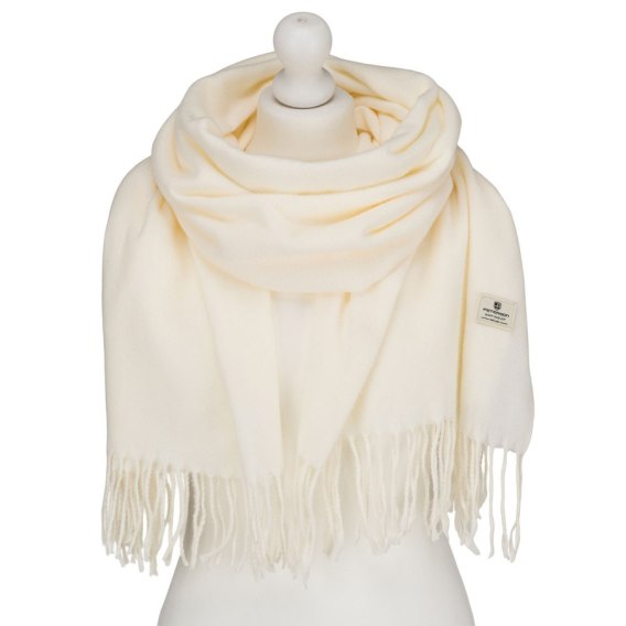 Stylowy, biały szalik damski, dwustronny. Idealny na zimę, jesień i wiosenne chłody. Wykonany z wysokogatunkowego poliestru. Pasuje zarówno do eleganckiego płaszcza, jak i do casualowej kurtki. Szalik ze stylowymi frędzlami.