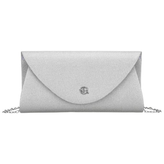 Brokatowa kopertówka damska z tkaniny syntetycznej w srebrnym. Zawieszona na srebrnym łańcuszku, który dodaje biżuteryjnego charakteru. Jednokomorowa, zapinana klipsem magnetycznym.
