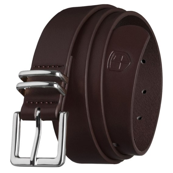 Ciemnobrązowy, wąski pasek damski ze skóry ekologicznej ze srebrną klamrą - Peterson