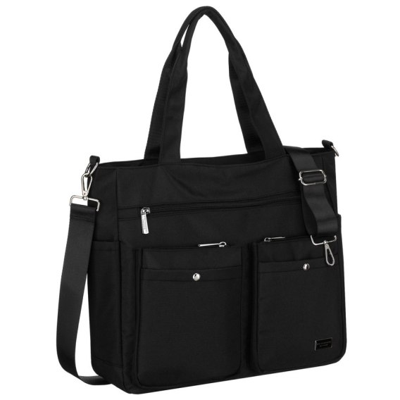 Czarna torba damska wykonana z poliestru. Wyposażona w przegrodę na laptopa, wygodne uchwyty i doczepiany, regulowany pasek. Jednokomorowa z aż jedenastoma dodatkowymi kieszonkami. Zamykana suwakiem.