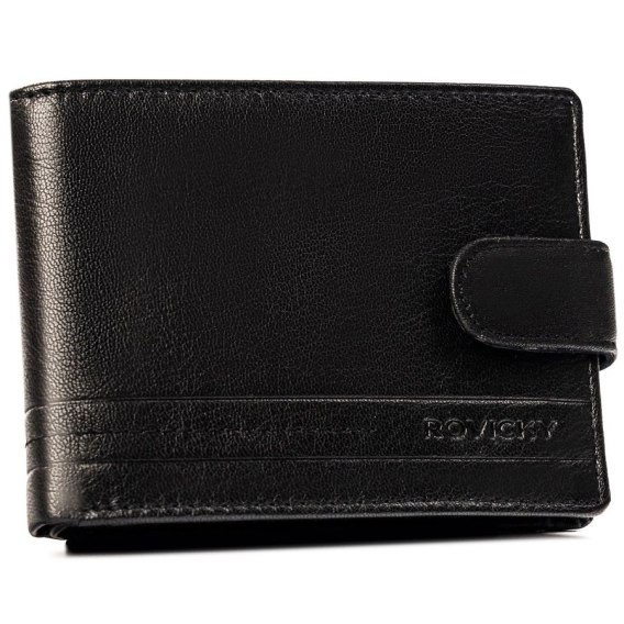 Duży, skórzany portfel męski w czarnym kolorze wyposażony w system RFID, zamykany zatrzaskiem - Rovicky