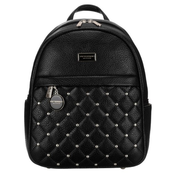 Elegancki czarny mały plecak damski zdobiony pikowaniem i srebrnymi nitami eko skóra Peterson