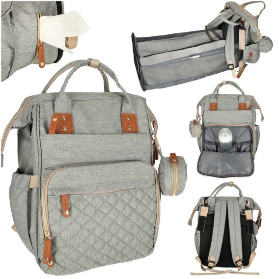 Podczas spaceru czy podróży z niemowlęciem z pewnością przyda Ci się dobra torba do wózka, w której zmieścisz wszystkie niezbędne rzeczy, a ten plecak z pewnością sprosta Twoim oczekiwaniom! Posiada dużą ilość przegródek i kieszeni, w tym specjalne miejsce z folią termoizolacyjną na butelki, a także kieszeń na brudne pieluchy. Dodatkowo tył plecaka przekształca się w przewijak umożliwiający zmianę pieluchy w dowolnym miejscu i momencie. Plecak możesz nosić na ramionach lub zawiesić go na wózku przy pomocy dołączonych zaczepów. Posiada port USB i kabel ułatwiający ładowanie telefonu w trakcie spaceru.